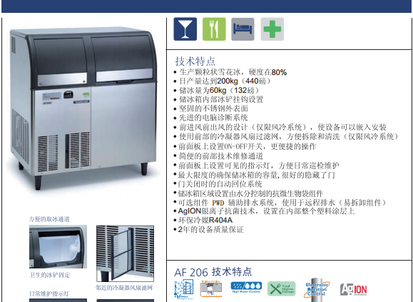 Scotsman雪花冰是一種最自然形態(tài)的冰,溫度略低于零度,很容易取用和堆放。斯科茨曼提供二種雪花冰:雪花冰和優(yōu)質(zhì)雪花冰,雪花冰含水量在25%較為潮濕但可塑性能很好適用性很廣。優(yōu)質(zhì)雪花冰更緊致含水量在15%-18%比普通的雪花冰更干燥,在需冷藏的陳列臺(tái)能長時(shí)間保持濕潤而中途無須添加冰。雪花冰和優(yōu)質(zhì)雪花冰很適合試驗(yàn)室,飯店生鮮陳列,酒店自助餐臺(tái),凍飲的預(yù)制作,鮮果和生鮮的展示,葡萄酒和香檳酒的冷卻等等。